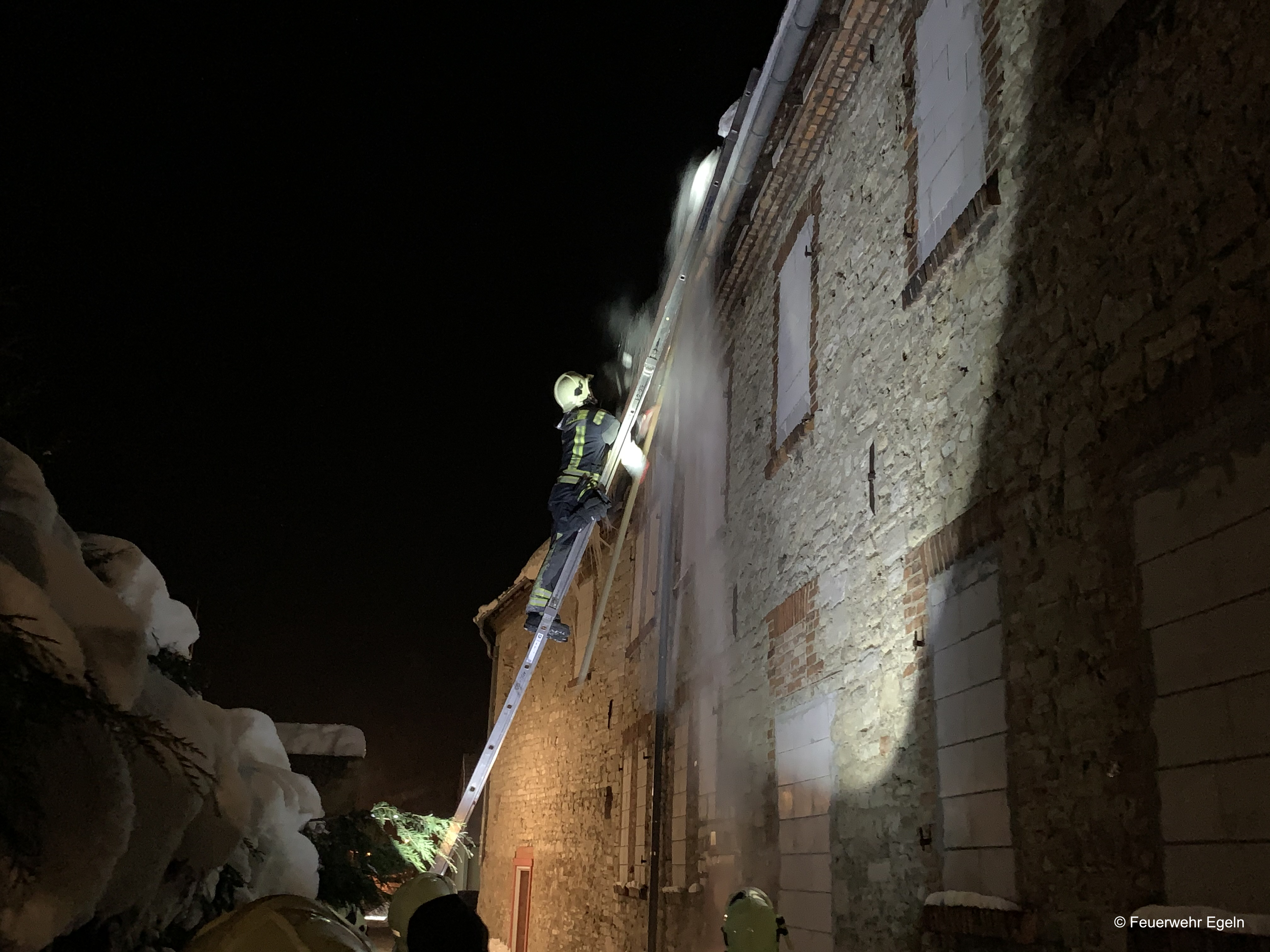 Die winterliche Wetterlage sorgte auch für Arbeit für die Egelner Feuerwehr. Die Einsatzkräfte wurden gerufen, weil Eiszapfen und größere Eisbrocken von einer Dachrinne und einer Dachfläche auf den Gehweg zu stürzen drohten. Im schlimmsten Fall würde eine erhebliche Verletzungsgefahr für Fußgänger drohen. Mithilfe von Steckleiterteilen konnten die Eiszapfen und Eisplatten erreicht und mit einem Einreißhaken beseitigt werden.