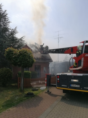 Der Alarm für die Feuerwehr Egeln erfolgte um 13:04 Uhr. Beim Eintreffen der Egelner Einsatzfahrzeuge waren die Feuerwehren Borne und Unseburg bereits im Einsatz und hatten zur Brandbekämpfung mehrere C-Rohre vorgenommen. Eine Hälfte des Doppelhauses und ein angebauter Schuppen standen im Vollbrand, die zweite Haushälfte wurde teilweise von den Flammen erfasst. Drei Personen, die sich in dem Doppelhaus befunden hatten, wurden rettungsdienstlich versorgt. Zwei größere Gasflaschen konnten von den Einsatzkräften aus dem Brandobjekt geborgen und gekühlt werden. Von der Egelner Drehleiter wurde ein Rohr im Außenangriff eingesetzt, zudem gingen die Egelner Trupps wechselweise mit den Kameradinnen und Kameraden der anderen im Einsatz befindlichen Wehren mit mehreren C-Rohren im Innenangriff vor. Die Wasserversorgung wurde durch Unterflurhydranten und eine Zisterne sichergestellt. Um an letzte Glutnester zu gelangen, mussten über die Drehleiter Teile der Dachbedeckung aufgenommen werden.