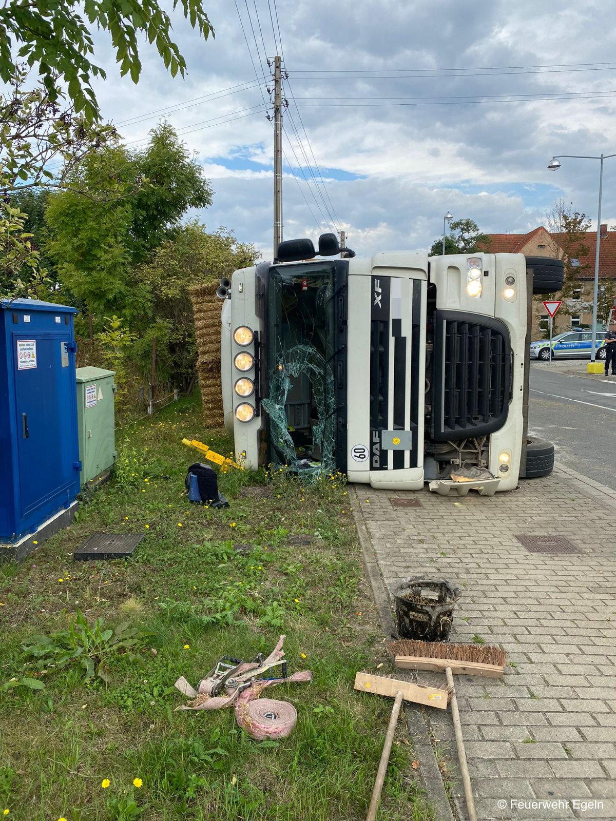 Ein LKW voll mit Strohballen beladen war beim Abbiegen umgekippt. Das Fahrzeug lag beim Eintreffen der Egelner Einsatzkräfte auf der Seite neben der Fahrbahn. Die Ladung hatte sich neben dem Laster am Straßenrand verteilt. Hydraulikflüssigkeit war ausgelaufen. Der Fahrer hatte leichte Verletzungen erlitten, die vom Rettungsdienst vor Ort ambulant versorgt wurden. Nach der Absicherung der Einsatzstelle gegen den fließenden Verkehr und eine mögliche Brandgefahr wurden die ausgelaufenen Flüssigkeiten mittels Bindemittel aufgenommen. Die Feuerwehr Egeln blieb während der Bergung des Fahrzeuges und der Ladung zur weiteren Absicherung vor Ort. Gegen Mittag konnte der Einsatz beendet werden.