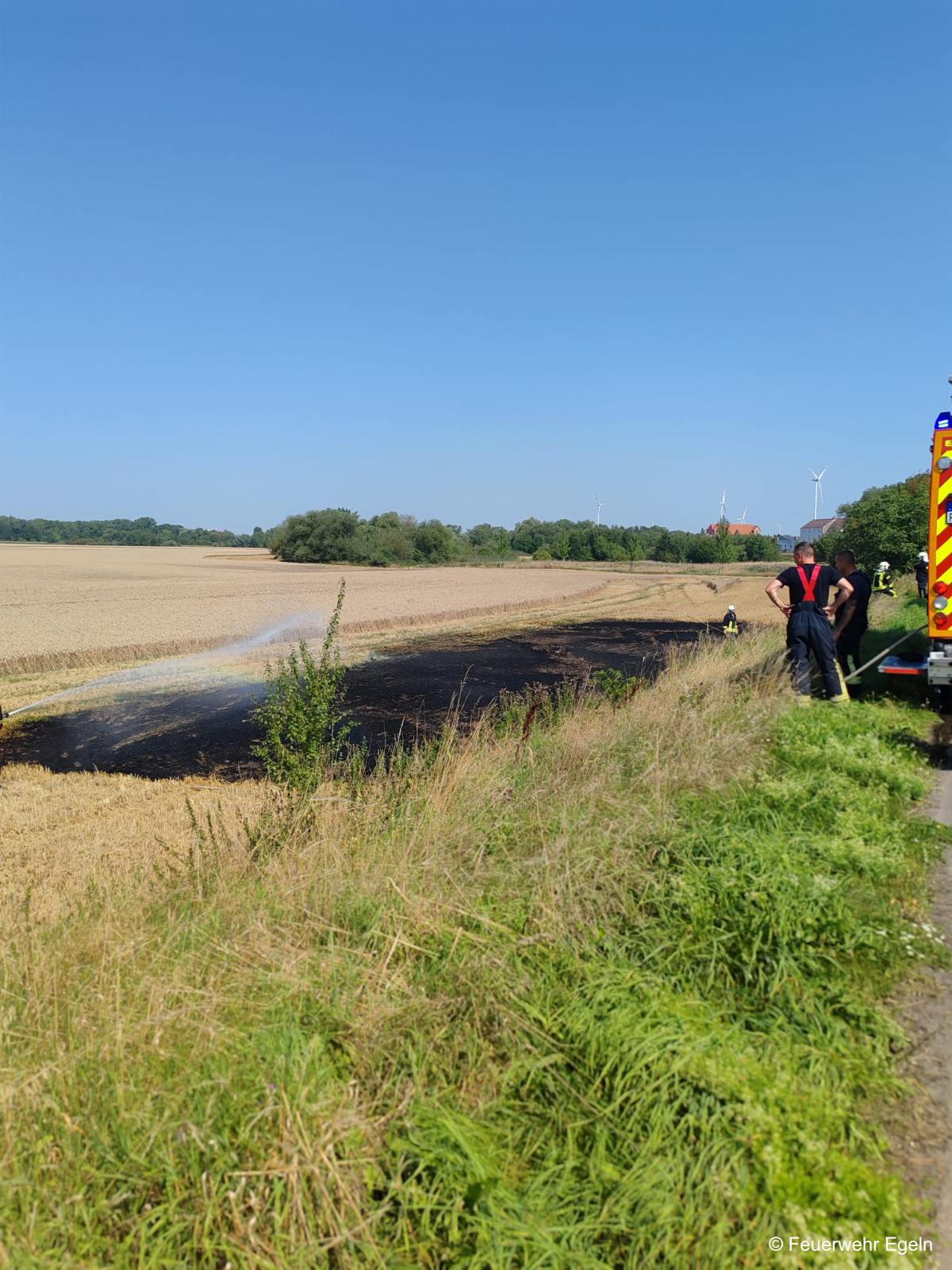 Gemeldet wurde ein Grasnarbenbrand an der Straße Richtung Egeln Nord. Vor Ort stellten die Einsatzkräfte fest, dass es nicht nur die Straßenböschung brannte, sondern das Feuer bereits ein angrenzendes Stoppelfeld erfasst hatte. Direkt daneben befand sich ein noch nicht abgeerntetes Getreidefeld. Der Brand war beim Eintreffen der Egelner Feuerwehr kurz davor, vom Stoppelfeld auf das Getreidefeld überzugreifen. Ein Bürger hatte an der Einsatzstelle bereits erste Löschmaßnahmen ergriffen und sich dabei Verletzungen zugezogen.