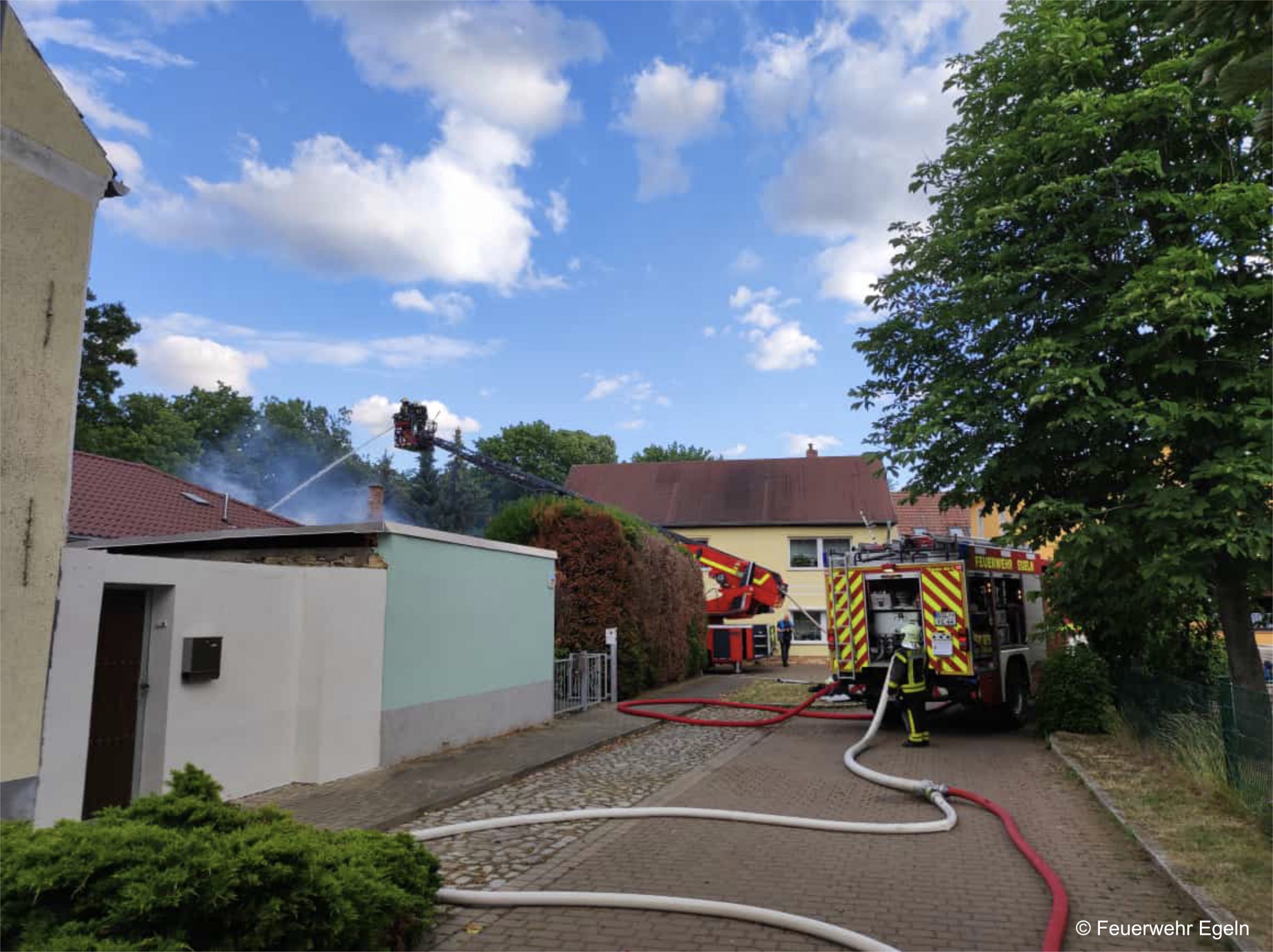 Neben den bereits eingesetzten Wehren bestand die Aufgabe der Einsatzkräfte der Feuerwehr Egeln darin, eine Riegelstellung zum Schutz des rechts vom Brandobjekt befindlichen Gebäudes zu errichten. Dafür wurden drei Angriffsleitungen aufgebaut: Ein Löschangriff erfolgte über den Korb der Egelner Drehleiter, ein weiteres Rohr wurde über ein Steckleiterteil in das Obergeschoss sowie ein Rohr im Außenangriff vorgenommen.