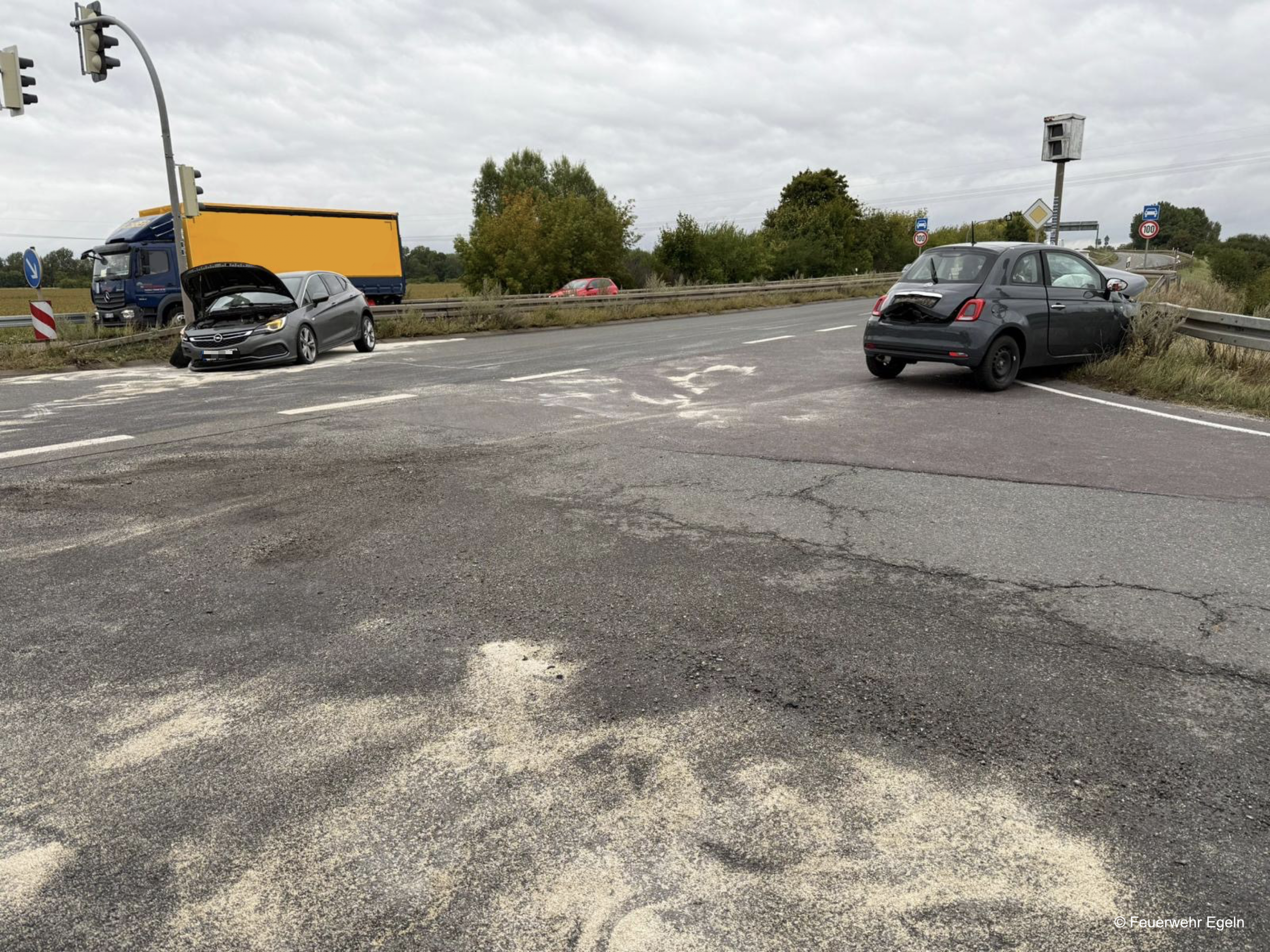 Die Feuerwehr Egeln wurde alarmiert, weil nach einem Unfall Betriebsstoffe aus den verunfallten Fahrzeugen austraten. Auf der Kreuzung waren zwei PKW zusammengestoßen, dabei hatten drei Personen Verletzungen erlitten.