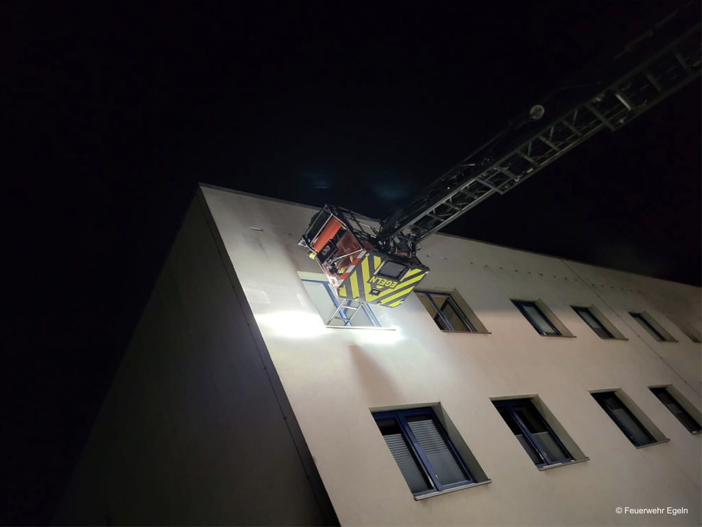 Die Feuerwehr Egeln wurde mit der Drehleiter zum Brand eines Schwerpunktobjektes in der Ortslage Schneidlingen alarmiert. Vor Ort ergab die Lageerkundung an der Einsatzstelle ein stark verrauchtes Gebäude, in dem in einem Fenster Feuerschein zu sehen war. Mehrere Personen (Kinder) waren im brennenden Gebäude eingeschlossen und warteten im 2. Obergeschoss auf die Rettung durch die Feuerwehr.