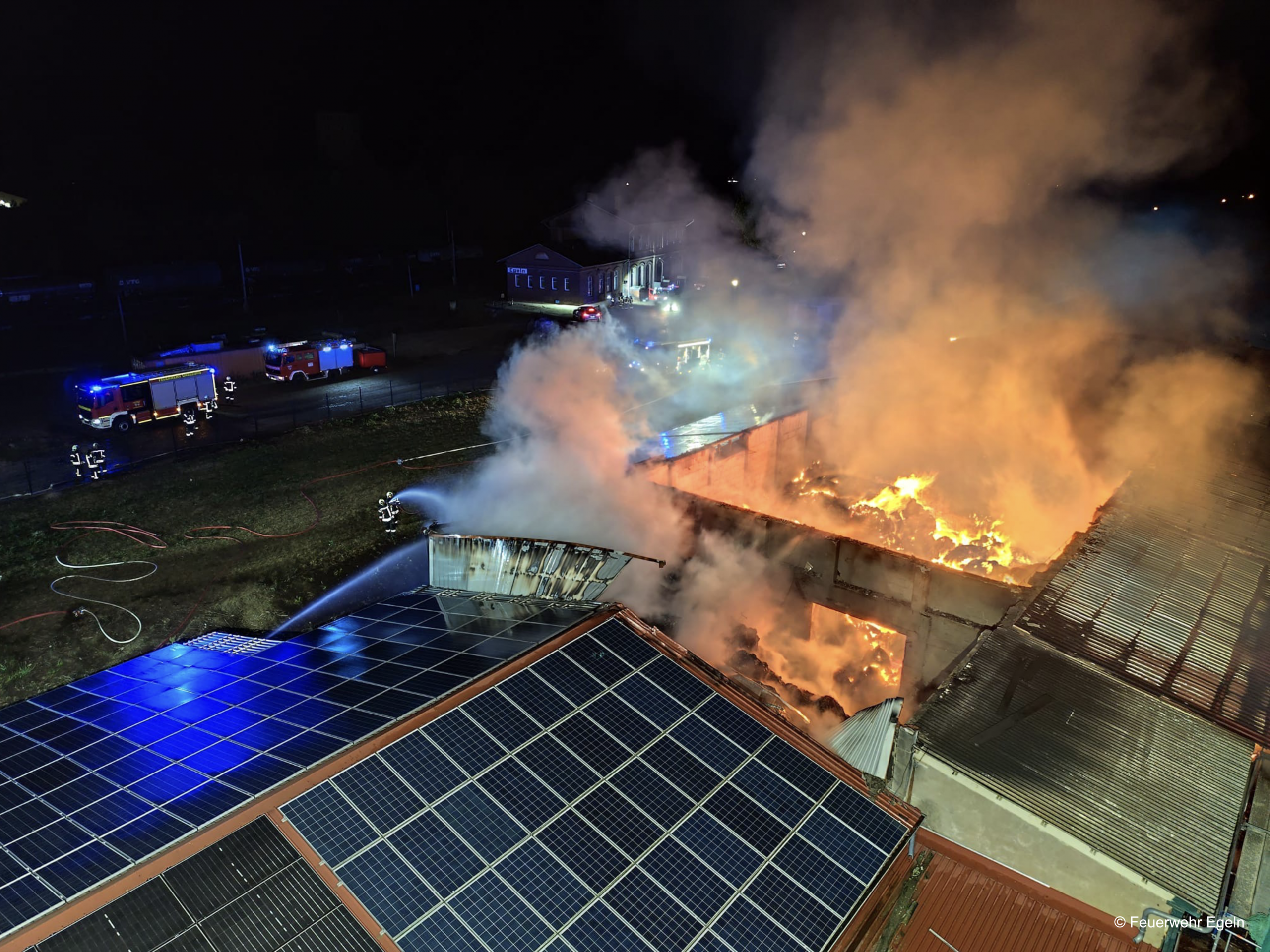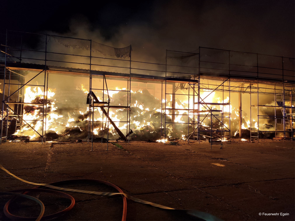 Vor Ort wurde der Vollbrand einer landwirtschaftlichen Halle von ca. 80 x 20 Metern festgestellt. Im brennenden Objekt lagerten in großen Mengen Stroh, Heu, Saatgut sowie weitere Technik. Auf dem Dach befand sich eine Photovoltaikanlage. Teilweise begannen die Halle und das Dach bereits einzustürzen. Unmittelbar angrenzende Hallen waren beim Eintreffen der ersten Egelner Einsatzkräfte akut vom Übergreifen der Flammen bedroht.