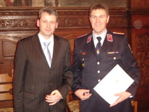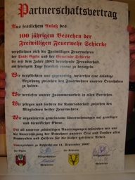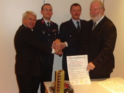 Damit die Freundschaft zwischen beiden Wehren auch in Zukunft Bestand hat, unterzeichneten die beiden heutigen Feuerwehr-Chefs Steffen Malucha und Torsten Schuck gemeinsam mit den Bürgermeistern beider Orte Reinhard Luckner und Jochen Ermisch kürzlich einen neuen Partnerschafts-Vertrag. Der Rahmen hätte feierlicher nicht sein können: Die Feuerwehr Schierke wurde Mitte September stolze 100 Jahre alt. Die Gemeinde Schierke hatte zum Festakt geladen. Bei einer kleinen Feierstunde wurde der neue Vertrag am 15.09.2007 besiegelt. Die beiden Wehrleiter und Bürgermeister haben sich damit auch in Zukunft zu einer partnerschaftlichen Verbindung beider Feuerwehren bekannt. Bei der Unterzeichung waren auch die ehemaligen Wehrleiter Heiner Grabau und Ingolf Schmidt anwesend.