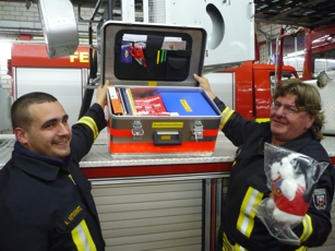 Der Themenkoffer "Brandschutzaufklärung" enthält eine Vielzahl an Materialien, mit denen kleine Unterrichtseinheiten in Schulen und Kindergärten gestaltet werden können. Mit einem Extra-Telefon wird Kindern z.B. vermittelt, wie man einen Notruf absetzt. Eine Handpuppe erklärt das richtige Verhalten im Brandfall. Enthalten sind zudem Spiele zum Brandschutzwissen, Kopiervorlagen,  Themen-Hefte und Videofilme. Das Bild zeigt die Kameraden Andreas Nitschwetz (li.) und Andreas Wettin mit dem Brandschutzkoffer.