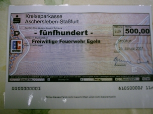 Möglich wurde das Projekt, weil die "PS-Lotterie" der Kreissparkasse Aschersleben-Staßfurt einen Teil ihres Gewinnes dankenswerterweise für diese sinnvolle Anschaffung im Wert von rund 1.200 € zur Verfügung stellte. Den fehlenden Restbetrag zahlte der "Verein zur Förderung des Brandschutzes in der Stadt Egeln e.V."