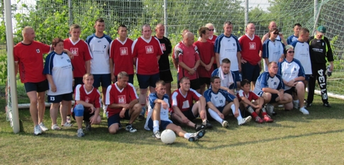 Das Gruppenfoto zeigt die Fußballmannschaften beider Feuerwehren (die Feuerwehr Egeln in den roten Trikots).