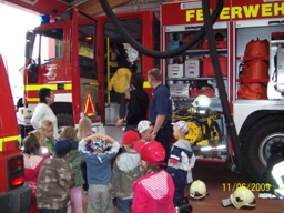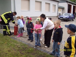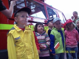 (07/2009) Da waren leuchtende Kinderaugen gewiss: Am 11. Juni 2009 besuchten 21 Kinder im Alter von 4-5 Jahren und zwei Erzieher der "Sonnenkindergruppe" der Kita "Bördespatzen" die Egelner Feuerwehr. In zwei Gruppen aufgeteilt, nahmen die Kinder bei einem Rundgang durch die Feuerwache von der Technik Besitz. Wie fühlt es sich an, wenn man den Helm aufsetzt oder eine Feuerwehr-Einsatzjacke trägt? Die Kleinen bekamen in aller Ruhe alles erklärt und durften dabei natürlich alles anfassen und ausprobieren.