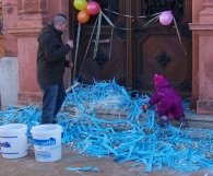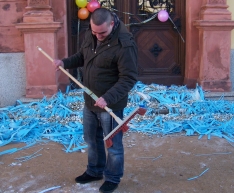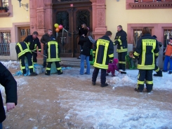 (01/2009) Wer männlich, 30 Jahre alt und noch nicht unter der Haube ist, den ereilt in unseren Breiten ein besonderes Schicksal: Er muss die städtische Rathaustreppe fegen. So unlängst am 6. Januar 2009 mit unserem Feuerwehrmitglied Andreas Nitschwetz geschehen. Seine Kameradinnen und Kameraden von der Egelner Feuerwehr hatten dafür extra eine Menge "Kehrgut" auf den Stufen verteilt, die es nun mit einem Besen fachgerecht zu säubern galt. Der gemeine Trick dabei: Die Bastelabteilung der Feuerwehr Egeln hatte einen Besen entworfen, dessen Borsten von nicht ganz normgerechter Einheitslänge waren. Zudem war der Besenstiel mit einem "Spezial-Scharnier" versehen, worunter die Stabilität des Kehrgerätes doch enorm litt.