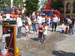 Das Konzept ging auf. Schon beim Aufbau gegen 9:30 Uhr wurden viele Egelner auf die Feuerwehr aufmerksam und erkundeten interessiert die Einsatztechnik. Zudem leuchteten sofort viele Kinderaugen, als die fünf Feuerwehrfahrzeuge auf dem Marktplatz entdeckt wurden. Dementsprechend dicht umlagert waren die Kübelspritze, die Bastelecke und die Fahrersitze der Feuerwehrautos - einmal am Steuer der großen roten Autos sitzen ...