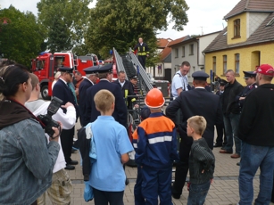 Als am Samstag, den 5. September 2009 dann aber kurz nach 14 Uhr der Tag der offenen Tür eröffnet wurde, schien plötzlich die Sonne! Zahlreiche befreundete Feuerwehren und Egelner Bürgerinnen und Bürger waren mittlerweile gekommen. Der Wehrleiter der Feuerwehr Egeln Steffen Malucha, fand kurze Worte der Begrüßung und machte deutlich, worauf es am heutigen Tage ankommt: Endlich und langersehnt kann die Egelner Wehr ihr neues Drehleiterfahrzeug in Dienst stellen! Gedankt wurde vor allem dem Egelner Stadtrat und dem Bürgermeister, die mit ihrer Entscheidung zum Neukauf die Beschaffung des wichtigen Rettungsfahrzeuges möglich machten. Und das alles gestemmt durch die Stadt Egeln - ohne zusätzliche Fördermittel von Land und Bund. Eine wahrer Kraftakt. Dennoch, ein unverzichtbares Fahrzeug und Rettungsmittel aus höchster Not - so formulierte es auch Egelns Bürgermeister Reinhard Luckner in seiner folgenden Ansprache. Er machte nochmals deutlich, dass hier kein teures Spielzeug beschafft wurde sondern ein Fahrzeug, welches der Sicherheit aller Einwohner in Egeln und Umgebung dienen wird. Dennoch wünscht sich Luckner natürlich so wenig Einsätze wie möglich. Bei zwei Einsätzen hat sich die neue Drehleiter in den letzten Wochen bereits bewähren müssen. Es folgte die offizielle Übergabe der Fahrzeugschlüssel an den Wehrleiter. Dann war es soweit: Per Funkspruch wurde das neue Schmuckstück herangeordert, welches vorher versteckt in einer Seitenstraße geparkt war. Mit Martinhorn, Sirene und Blaulicht durfte der für die Drehleiter verantwortliche Maschinist Edwin Zwintzscher dann vorfahren und das Fahrzeug präsentieren.