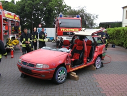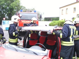 (07/2009) Bei einer Schauvorführung demonstrierte die Egelner Feuerwehr am 27.06.2009 ihr Können. Anlässlich eines Aktionstages des Egelner Autohauses "Schmidt und Söhne" wurde dargestellt, wie eingeklemmte Unfallopfer aus einem Fahrzeug gerettet werden. Dafür stellte der Chef des Autohauses extra ein altes Fahrzeug zur Verfügung. Die hydraulischen Rettungsgeräte der Feuerwehr Egeln wurden eingesetzt, um die "Verunfallten" fachgerecht und behutsam zu befreien. Somit war die Schauvorführung gleichzeitig eine praktische Einsatzübung für die Feuerwehrleute. Autohauschef und -mitarbeiter durften später sogar einmal selbst "Hand anlegen" und die Rettungstechnik ausprobieren. Die Darstellung der verheerenden Wirkung einer Fettexplosion in der heimischen Küche und die Ausstellung der Feuerwehrautos rundete das Schauprogramm für die Autohausbesucher ab.