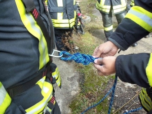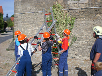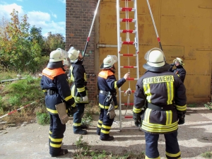 Auch der Umgang mit den Leitern und dem Gerätesatz Absturzsicherung wird geübt.