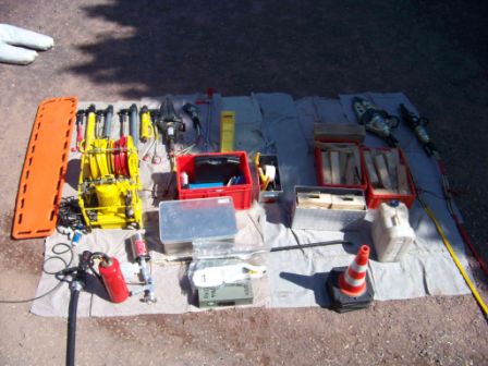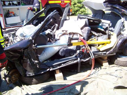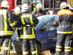 Begonnen wurde die Rettungsübung mit dem richtigen Aufbau eines Bereitstellungsplatzes für die Gerätschaften. Dann galt es, verschiedene Techniken zur Befreiung einer in einem Auto eingeklemmten Person anzuwenden und auszuprobieren. Dafür wurde das Fahrzeug zuerst durch Stabilisierung und Unterbau sowie dem Herstellen der Löschbereitschaft für den Fall eines Entstehungsbrandes gesichert. Besonderes Augenmerk galt der Airbagsicherung. Nicht ausgelöste Airbags können zu einer großen Gefahr für die Einsatzkräfte und die im Fahrzeug eingeklemmte Person werden. Als nächstes wurde das Glasmanagement trainiert. Die Seitenscheiben wurden mittels Klebeband abgeklebt und in einem Stück entfernt, damit sie für die zu rettende Person keine Gefahr durch Splitter mehr darstellen. Zudem wurde die Frontscheibe entfernt. Mit den hydraulischen Rettungsgeräten Schere und Spreizer wurden dann die Türen entfernt und das Dach abgetrennt. Während dieser Arbeiten wurde wiederholt der Fahrzeuginnenraum gründlich nach nicht ausgelösten Airbags abgesucht, die im gesamten Auto z.B. auch im Bereich des Daches verbaut sein können. Es gibt mittlerweile Fahrzeuge auf dem Markt mit 13 Airbags. Tendenz zunehmend. Im Fußraum des PKW kam nun der Pedalschneider zum Einsatz - eine Art hydraulische Mini-Schere für Arbeiten in engstem Raum und gleichzeitig mit großer Kraft, um auch massive Stahlstäbe wie Pedale zu durchtrennen. Dieses Werkzeug ist wichtig, da Unfallopfer bei Verkehrsunfällen häufig im Bereich der Füße eingeklemmt werden. Mit Hilfe der hydraulischen Rettungszylinder wurde das Fahrzeug dann soweit auseinandergedrückt, dass eine Rettung der eingeklemmten Person möglich wurde. Die Rettung geschah dann mittels eines stabilen Brettes, eines sogenannten Spineboards, um eine möglichst achsengerechte Lagerung des Patienten während der Rettung zu ermöglichen. Während der gesamten Übung gaben die Ausbilder Hilfestellung und Tipps zum Anwenden der Rettungsgeräte.