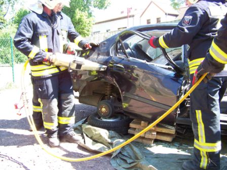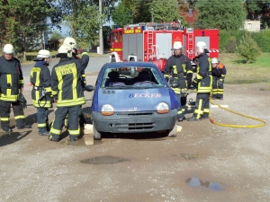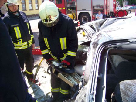 Zwischen 8 und 9 Uhr wurden an der Wache Egeln die Vorbereitungen für den Übungstag getroffen. Dazu wurden zwei alte Autos präpariert, denn im ersten Ausbildungsteil galt es, eine eingeklemmte Person fachgerecht aus einem Unfallfahrzeug zu retten. In zwei Gruppen wurde dann der richtige Umgang mit den hydraulischen Rettungsgeräten geübt. Als "Unfallopfer" saß eine Puppe in dem Fahrzeug. Die beiden Ausbilder Carsten Beinemann und Michael Witte von der Feuerwehr Egeln erklärten alle notwendigen Arbeitsschritte in aller Ruhe, denn anders wie beim Rettungseinsatz hat man bei solch einem Ausbildungstag die Chance, ohne Einsatzstress alle Varianten der technischen Rettung auszuprobieren und den Umgang mit den schweren Hydraulikwerkzeugen zu üben.