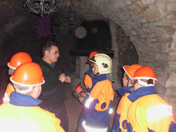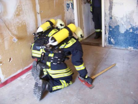 Doch nicht nur die technische Hilfeleistung stand auf dem Programm dieses Ausbildungstages. Geübt wurde als zweiter Schwerpunkt die Brandbekämpfung in Gebäuden. Die Umland Wohnungsbau GmbH Egeln hatte den Einsatzkräften extra ein geeignetes Übungsobjekt zur Verfügung gestellt. Als Ausbilder für die Brandbekämpfung leiteten Andres Mosel und Andreas Nitschwetz die Gruppen an. Trainiert wurde zuerst das Vorgehen in einem verrauchten, unbekannten Gebäude unter Nullsicht-Bedingungen. Dazu wurden die Atemschutzmasken der Feuerwehrleute extra mit Flammschutzhauben abgedeckt. Raum für Raum wurde auf diese Weise schrittweise nach vermissten Personen abgesucht. Laufend wurden von den vorgehenden Trupps Informationen zu den Räumlichkeiten an den Gruppenführer "draußen" per Funkgerät übermittelt, damit sich dieser ein Bild davon machen konnte, wo sich seine Trupps momentan befinden. Außerdem hatten die Trupps beim Absuchen der Räume die Aufgabe, versteckte Gegenstände zu finden und über Funk mitzuteilen, um was es sich handelt. Mit jedem Trupp wurde nach dem Durchgang durch das Gebäude eine ausführliche Auswertung durchgeführt.