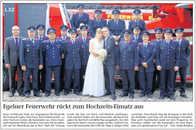 (09/2011) Bei der Hochzeit ihres Feuerwehrkameraden Fabian Lohmann war die ganze Feuerwehr Egeln auf den Beinen. Traditionell haben sich die Feuerwehrleute für das Brautpaar einige Überraschungen ausgedacht. Bereits am frühen Morgen wurden die Feuerwehrautos festlich geschmückt.