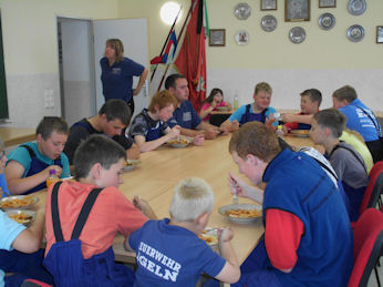 Erst wird das Essen gemeinsam zubereitet und gekocht. Dann isst die Mannschaft gemeinsam.