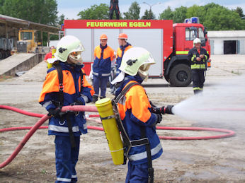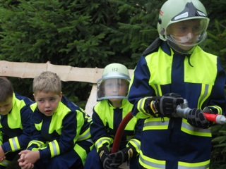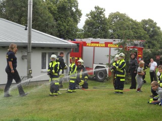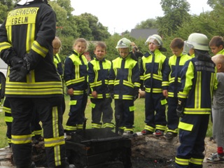 Die Übergabe der Anzüge und der Spielgeräte an die Kinderfeuerwehr fand am 25.06.2011 bei der Egelner Feuerwehr statt. Die Anzüge haben dann auch gleich ihre "Feuertaufe" bestanden: Beim Dienst der Kinderfeuerwehr stand das Thema "Brennen und Löschen" auf dem Plan. Zuerst wurde das Thema im Unterricht besprochen, dann durften die Kinder die heiß ersehnten Sachen erstmals Anziehen und zum Abschluss ein kleines Holzhaus löschen - natürlich unter Aufsicht der erwachsenen Feuerwehrleute.