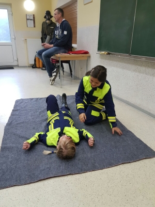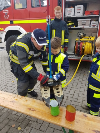 die Leiterin der Kinderfeuerwehr Jenny Kasten. Die Kinder probierten das