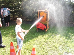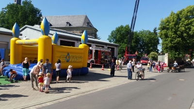 Spielgeräte bereit. Die Feuerwehrleute laden ein, die Feuerwehrautos und