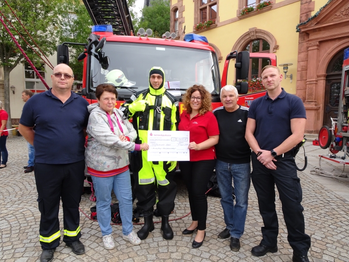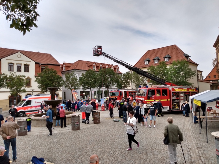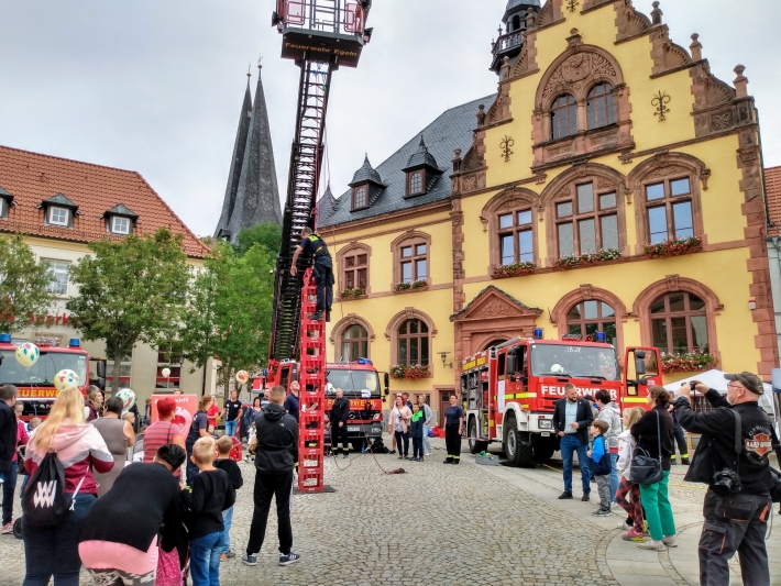 Egeln präsentierte sich am 07.09.2019 auf dem Egelner Marktplatz Feuerwehr zum Anfassen und Ausprobieren - buntes Programm für alle Das Wetter meinte es gut mit uns. Nach bangen Blicken in den Himmel war es dann doch den Tag über trocken und ab und zu ließ sich sogar die Sonne blicken. Nachdem der Aufbau erfolgt war, ließen die ersten Besucher nicht lange auf sich warten. Feuerwehr zum Anfassen und Ausprobieren zu bieten - das war unser Ziel, mit dem wir in die Mitte Egelns auf den Marktplatz gegangen sind. Das Programm hatte für jedermann etwas zu bieten: Kistenstapeln an der Drehleiter, Arbeiten mit hydraulischen Rettungsgeräten, spielend leichtes Anheben eines schweren Löschfahrzeuges mit pneumatischen Hebekissen, Kinderschminken, Glücksrad, Bällewerfen, Feuerwehr-Modenschau, Demonstration einer Fettexplosion, Rauchhaus, Erste-Hilfe-Lernstation, Rettungswagen der Johanniter-Unfallhilfe und vieles mehr. Für das leibliche Wohl sorgte der Förderverein der Egelner Feuerwehr mit Grillwurst und Steaks und natürlich diversen Getränken. Die Kinderfeuerwehr und die Jugendfeuerwehr stellten an eigenen Info-Ständen ihre Aktivitäten vor. Und natürlich durfte auch eine Hüpfeburg nicht fehlen. Natürlich wurde auch eine Einsatzübung durchgeführt: Professionell zeigte die Einsatzabteilung der Egelner Wehr, wie Menschen aus einem brennenden Haus gerettet werden. Als Einsatzobjekt diente das Egelner Rathaus, welches mit Diskonebel wie bei einem echten Feuer verraucht wurde. Als Opfer stellte sich kein geringerer als der Egelner Bürgermeister Reinhard Luckner zur Verfügung, den die Feuerwehrleute mit der Drehleiter vom Rathausturm retteten. Ein Angriffstrupp drang währenddessen voll ausgerüstet mit Pressluftatmern in das Rathaus ein, "löschte" den Brand und rettete weitere Menschen. Darunter war auch der Azubi von der Salzlandsparkasse Justin Kalberlah, der kurzerhand eine Fluchthaube aufgesetzt bekam, um unbeschadet durch den Rauch ins Freie geleitet zu werden. Justin bewies weiteren Mut und Geschick und belegte in seiner Altersgruppe den ersten Platz beim Kistenstapeln an der Egelner Drehleiter. Spendenübergabe als Höhepunkt Besonderer Höhepunkt waren die Spenden-Übergaben der Salzlandsparkasse und der Volksbank Börde-Bernburg: Die Leiterin der Egelner Sparkassen-Geschäftsstelle Mandy Scharnowski überreichte einen Überlebensanzug für die Wasser- und Eisrettung an die Feuerwehr im Wert von rund 1.700 Euro, dessen Anschaffung komplett von der Sparkasse finanziert wurde. Der Anzug wurde sofort in Dienst gestellt und schützt nun die Kameradinnen und Kameraden, die sich auf Gewässer begeben, um Menschen vor dem Ertrinken zu retten. Daniela Geist und Maximilian Kliebisch von der Volksbank übergaben an den "Verein zur Förderung des Brandschutzes in der Stadt Egeln" einen Scheck von 500 Euro als Unterstützung für die Arbeit der Egelner Feuerwehr. Wehrleitung, Vereinsführung, Bürgermeister und Verbandsgemeinde dankten herzlich für die Spenden. Das Engagement der regional tätigen Banken für lokale Organisationen wie die Freiwillige Feuerwehr kann nicht hoch genug gewürdigt werden. Als gegen 15 Uhr langsam zusammengepackt wurde, waren sich die Egelner Feuerwehrleute einig: Ein toller Erfolg und eine super Resonanz der Bevölkerung waren alle Mühen wert, die in die wochenlange Vorbereitung des Aktionstages investiert wurden. Der Förderverein unserer Wehr konnte sich über einige neue Mitglieder freuen, die ihre Beitrittserklärung direkt auf dem Marktplatz unterschrieben. Das eine oder andere Gespräch mit interessierten Bürgerinnen und Bürgern, die Interesse an einer aktiven Mitarbeit in der Feuerwehr Egeln bekundeten, konnte ebenfalls geführt werden. Und auch unsere Kinderfeuerwehr und Jugendfeuerwehr verzeichneten großes Interesse. Umso mehr bestärkt uns dieser Tag, die Darstellung unserer Arbeit und Mitgliederwerbung weiter auszubauen und derartige Aktionstage auch zukünftig zu wiederholen. Für die tatkräftige Unterstützung unseres Aktionstages und der vielfältigen Mitarbeit danken wir herzlich: