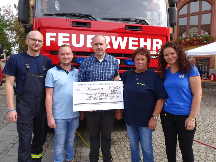 Foto: Daniela Geist (links) und Maximilian Kliebisch (2. v.r.) von der Volksbank Börder-Bernburg übergaben an den "Verein zur Förderung des Brandschutzes in der Stadt Egeln" einen Scheck von 500 Euro als Unterstützung für die Arbeit der Egelner Feuerwehr. Auf dem Foto v.l.n.r.: Matthias Kiesewetter, 2. Vorsitzender des Fördervereins; Maximilian Kliebisch; Christian Witte, 1. Vorsitzender des Fördervereins; Ute Schulze, Schatzmeisterin des Fördervereins; Daniela Geist.