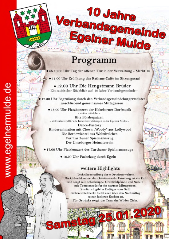 10 Jahre Verbandsgemeinde Egelner Mulde mit Technikausstellung der Feuerwehren (01/2020) Die Verbandsgemeinde Egelner Mulde feierte ihr 10-jähriges Bestehen. Ein Festprogramm fand dazu am Samstag den 25. Januar 2020 ab 10 Uhr im Egelner Rathaus und rund um den Egelner Marktplatz statt. Die Feuerwehren der Verbandsgemeinde waren mit einer Technikausstellung am Marktplatz vor Ort und freuten sich über viele kleine und große Besucher. Berichte und Fotos der Feierlichkeiten findet man auf der Facebook-Seite der Verbandsgemeinde.