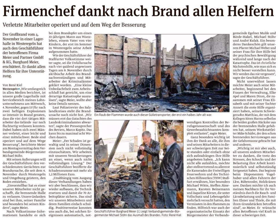 Danksagung des Firmeninhabers - Artikel aus dem "Salzlandkurier" der "Volksstimme" vom 18.11.2015: