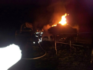 Brand mit einem C-Rohr. Das Stroh auf dem Anhänger wurde